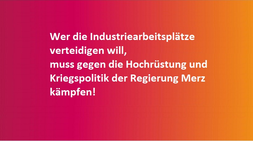 Die Regierung Merz/Klingbeil behauptet, mehr Rüstungsproduktion wäre ein Mittel gegen die Deindustrialisierung. Das Gegenteil ist der Fall. Rüstung erhöht nicht den Wohlstand und die Produktivität der Wirtschaft, sondern verschlingt sinnlos Milliarden, die viel besser für Zukunftsinvestitionen genutzt werden könnten. Die Behauptung, Russland bedrohe uns, ist Propaganda. Die NATO ist schon jetzt weit überlegen. Die Kriegsvorbereitung beschleunigt die Zerstörung der zivilen Produktion.